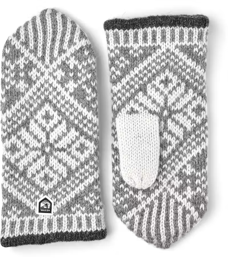A retro-inspired knitted mitten in soft, warming wool from Hestra Gloves of Sweden. Knitted in a classic Nordic Fair Isle design in wool yarn blended with a little polyamide for extra strength. The cuff is straight and finished off with a decorative contrast color. A knitted fleecy lining in a wool blend adds extra warmth. A beautiful, warming mitten for frosty autumn and winter days.
